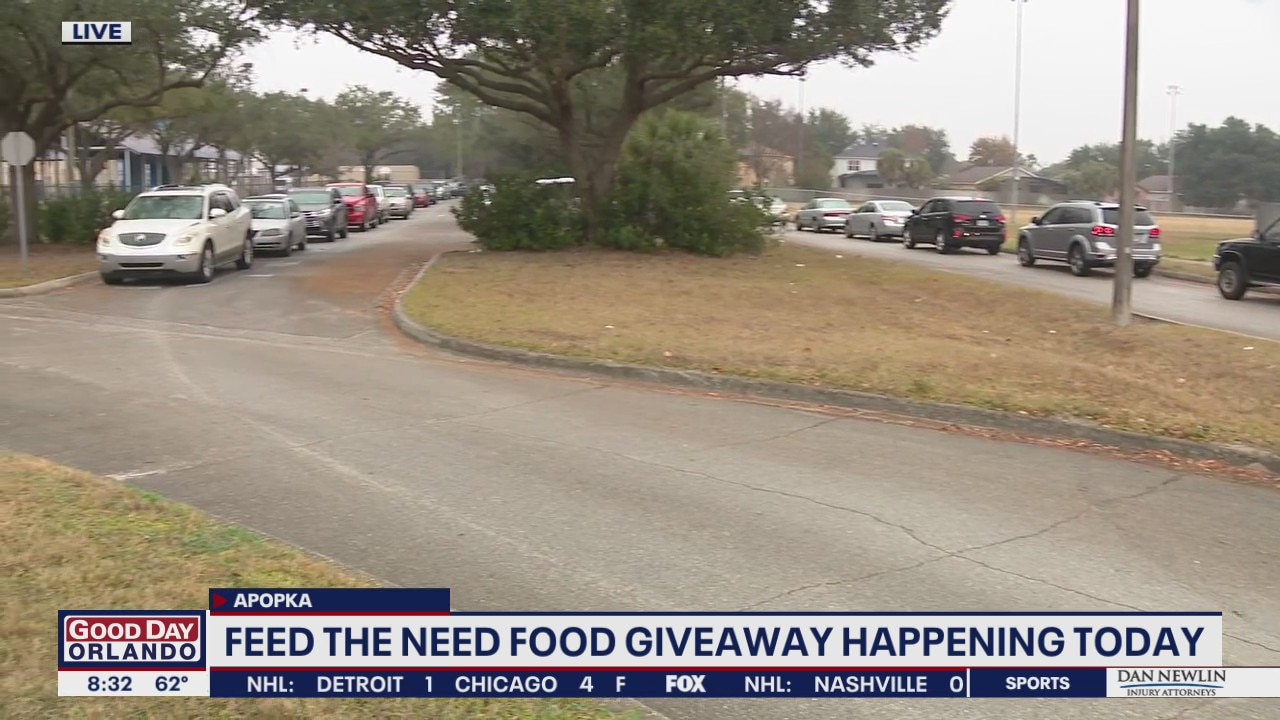 Families line up for the 'Feed the Need' food giveaway in Apopka on Saturday