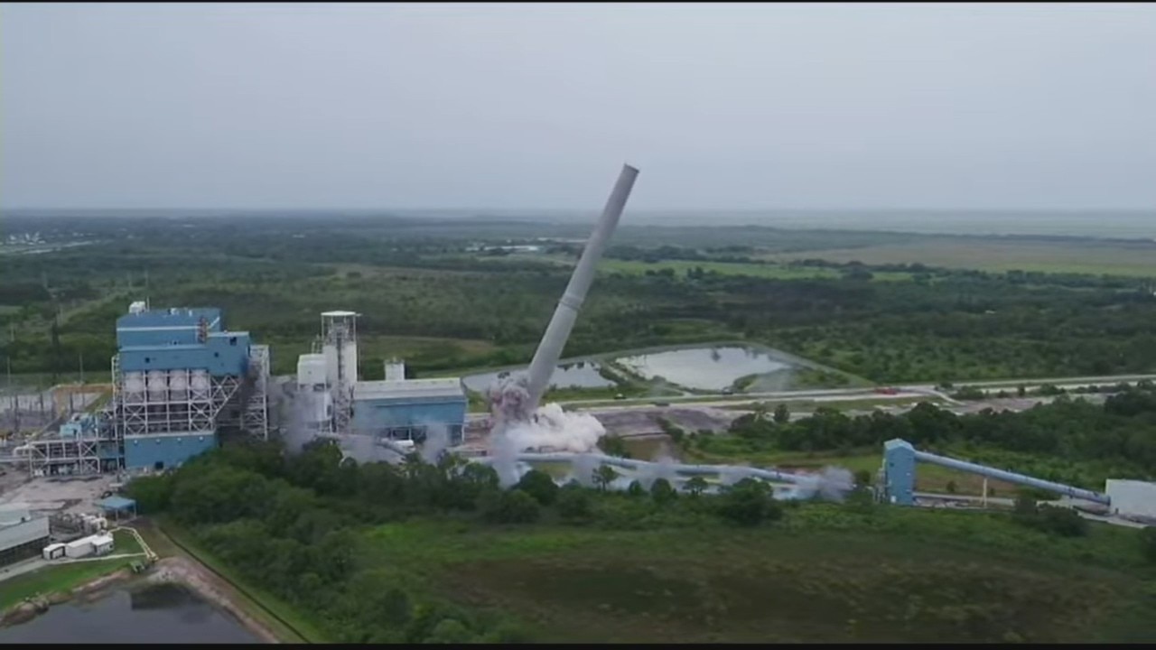 Florida Power & Light imploded the towering chimney stack of its last coal-fired generating plant on Wednesday, a milestone in its transition to cleaner energy sources.