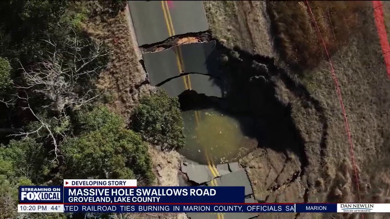 A large sinkhole swallowed part of a road in Lake County, prompting officials to close the stretch and warn residents that the collapse could continue to grow. The hole has raised concerns for nearby homes and drivers in the area.