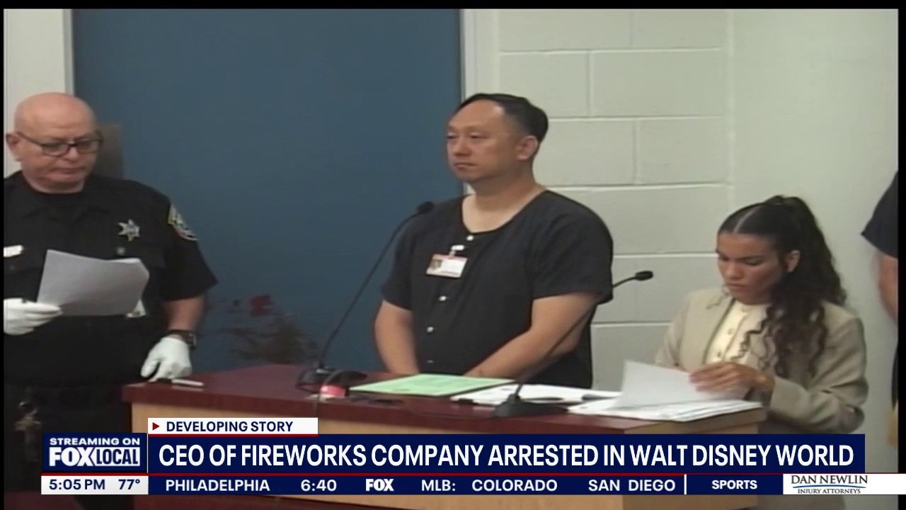 A business executive visiting Walt Disney World was arrested on a fugitive warrant tied to a deadly fireworks explosion in California that killed seven people, authorities said.