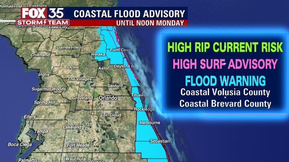 Meanwhile, the FOX 35 Storm Team is tracking hazardous beach conditions. There is a Coastal Flood Warning, a High Surf Advisory, and a high risk for rip currents. It is not recommended to enter the surf.