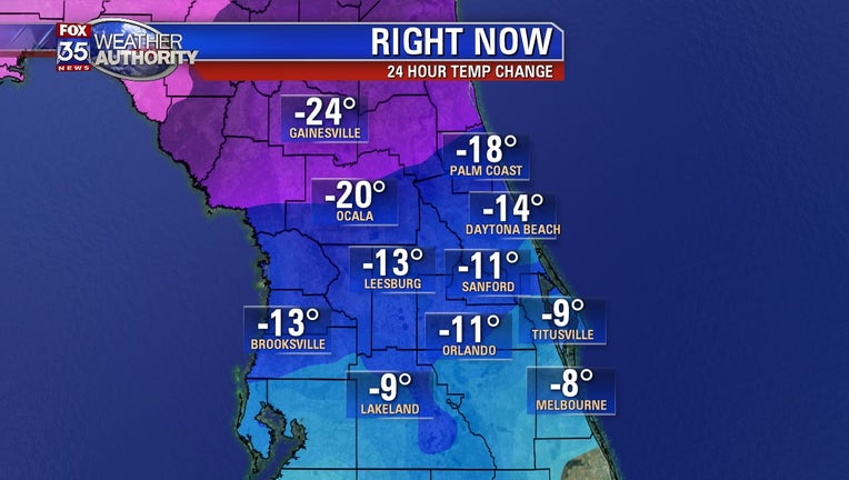 Orlando, Florida - The well-advertised cold front made it through Central Florida this morning, and temperatures behind the front are running about 10 to 20 degrees cooler than yesterday. The best way to measure a cold front's magnitude is the temperature drop, and these numbers are welcome after our record heat this week. Looking ahead, Sunday morning could be the coolest morning of the fall season, with lows in the 40s and 50s northwest of I-4.