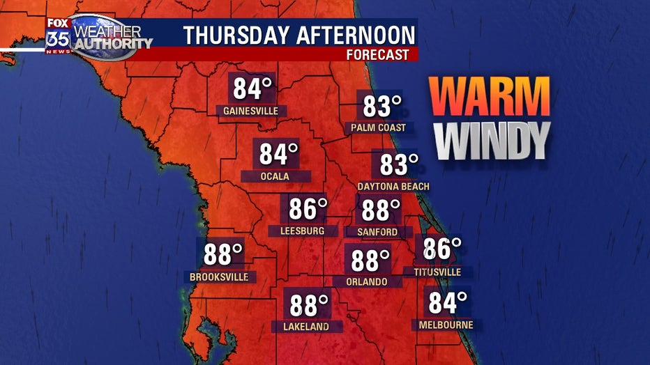 Winds will increase again promoting windy conditions and very warm temperatures. We're talking about highs around Orlando approaching 90 degrees before clouds really increase and afternoon rain chances rise. Right now, it looks like the main push of rain won't come until mid-afternoon (after 2pm) with a scattering of showers and storms.