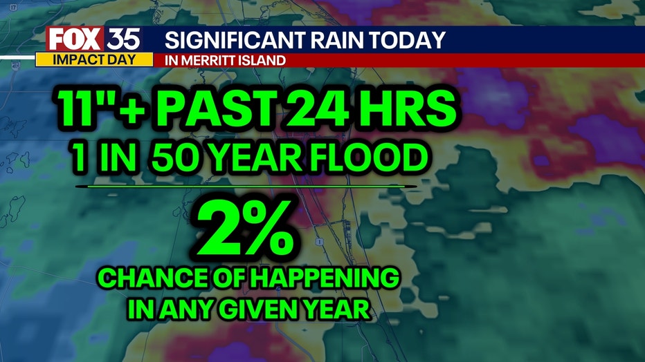 "The amount that fell in Merritt Island over the last 24 hours generally occurs once every 50 years, or has a 2% chance of happening in any given year," explained FOX 35 Storm Team Meteorologist Noah Bergren.