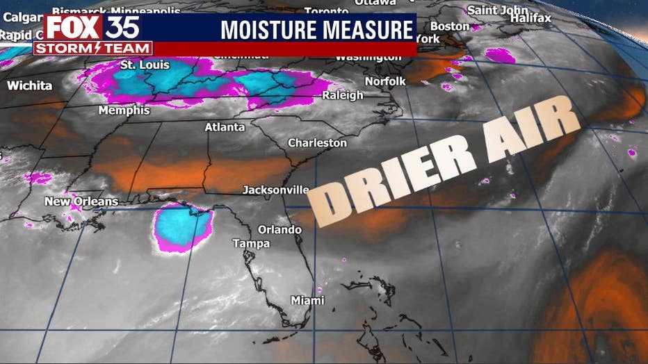 Drier air is currently invading the state and evident on the FOX 35 Storm Team's "Moisture Measure". The dry air will scour out some of the tropical moisture that has dominated the area for days on end. Simply stated: dry air means hotter temps and lower overall rain chances.