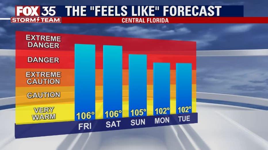 Afternoon highs across the interior will reach the mid-90s, and in the low-90s along the coast. The FOX 35 Storm Team is tracking heat index readings ranging from 101 to 106 degrees across East Central Florida through the weekend. If you have any outdoor plans, pack plenty of water, apply sunscreen generously and take breaks in the A/C if you can!
