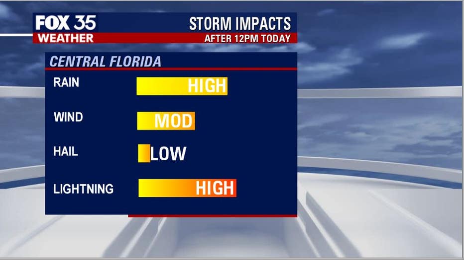 Storm threats will include very heavy rainfall, lightning and brief, periodic wind gusts to around 30-40 mph.