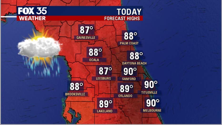Areas generally east of Orlando may have an opportunity to hit the 90-degree mark as rain takes a bit longer to arrive there.