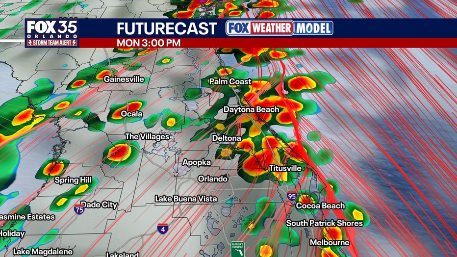 The most intense rain and storms should be focused right along the cold front, which is different than what we saw on Sunday. Isolated stronger to severe storms could ignite out ahead of it with a bit of lift, but the more widespread downpours and storms will be near the boundary as it pushes through Central Florida.