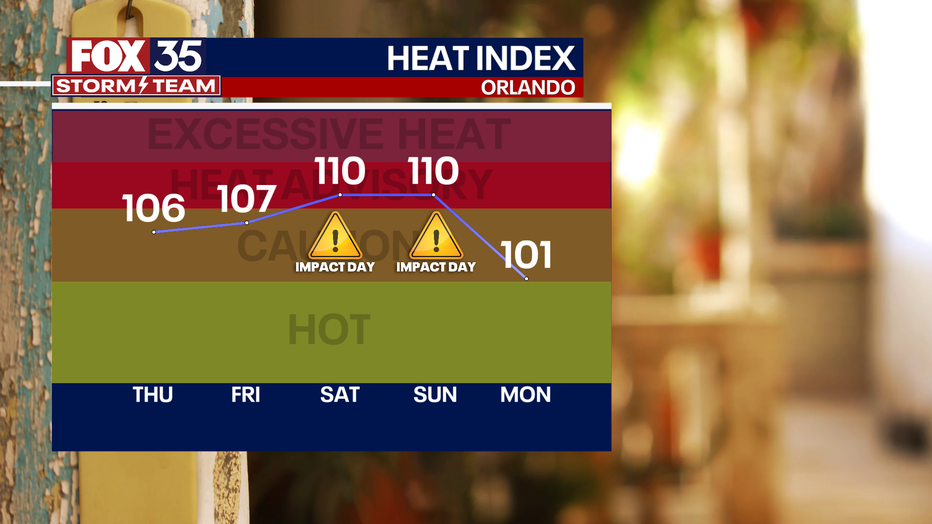 Temperatures will continue to rise into the weekend. We've declared both Saturday and Sunday FOX 35 WEATHER IMPACT DAYS to address some dangerous levels of heat. Actual highs are expected to hit in the 95- to 96-degree range. Humidity on top of the hot temps will bring the heat index into the 110-degree range in some cities. It'll be a good policy to limit outdoor activities during this time as heat illness could pose a big risk to your health. Stay hydrated and don't forget the sunscreen.