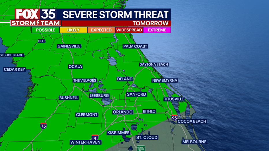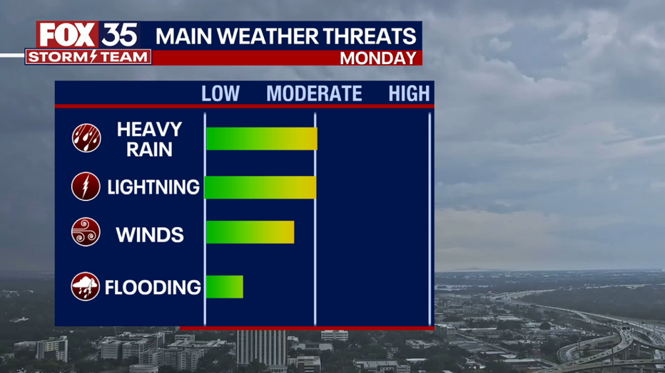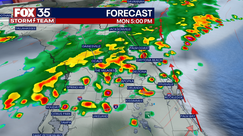 Strong to even severe storms will be possible across Central FL Monday afternoon. Storms will advance south out of southern Georgia and the Panhandle early in the afternoon and roll through our area. The strongest storms could bring severe winds so be weather aware! Localized flooding will also be a risk. As for temperatures, it will still be plenty hot ahead of storms with highs back in the mid 90s