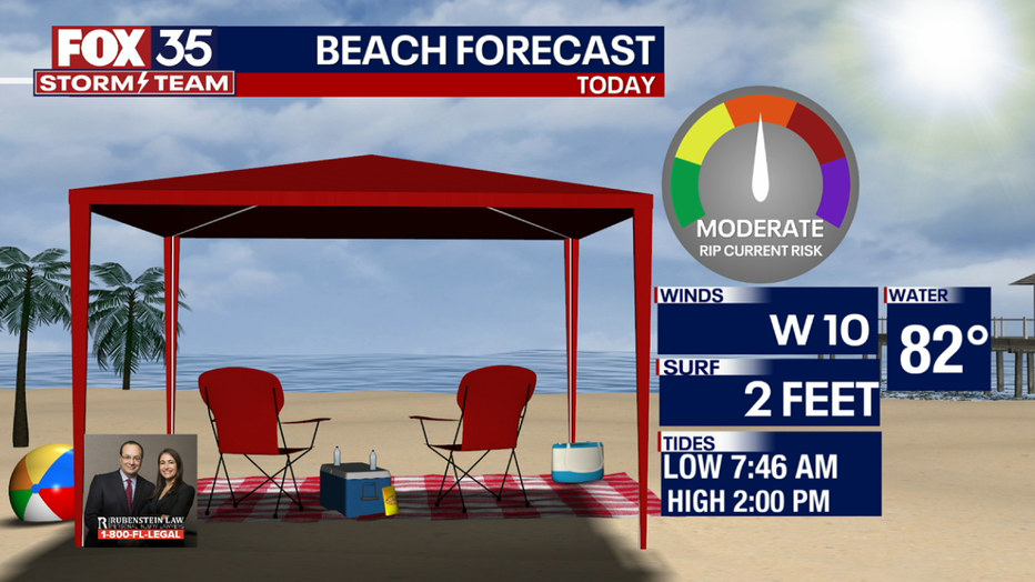 Lots of sunshine and heat along the coast today. Storm chances will arrive by 1-2 pm. Be sure to head off the beach to avoid the dangers of lightning! A moderate rip current risk will also return so be mindful of where you swim. Highs will warm to the mid 90s with a west wind. Some spots like Melbourne could flirt with record heat.