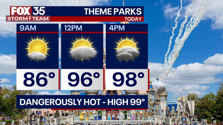 Stay hydrated at the theme parks today as forecast highs soar to near 98 with heat index values are expected to peak as high as 112 degrees. An isolated storm will be possible this afternoon, but it likely is going to be a sweltering day at the parks so drink plenty of water and find the A/C when you can!