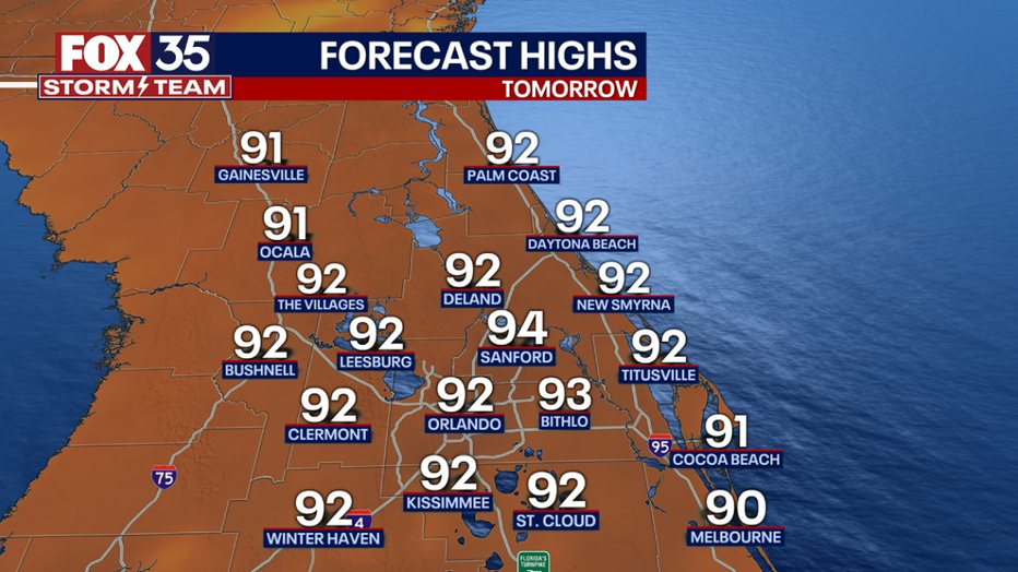 Rain chances will lower some early this week with slightly warmer highs expected. For any outdoor plans that you have, stay hydrated and keep your FOX 35 Storm Team weather app handy. Forecast highs by the middle of the week are expected to reach the mid-90s as heat builds. We could see storm chances return by midweek. In the tropics, things remain quiet for now. No tropical activity is expected within the next 2 to 7 days. If anything changes, the FOX 35 Storm Team will keep you updated.