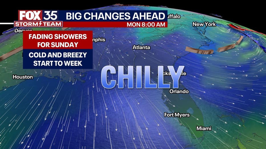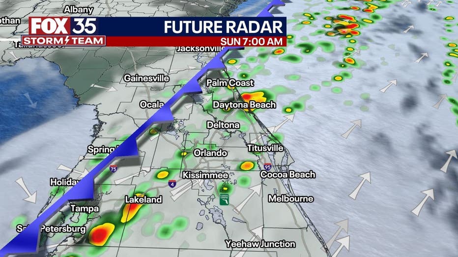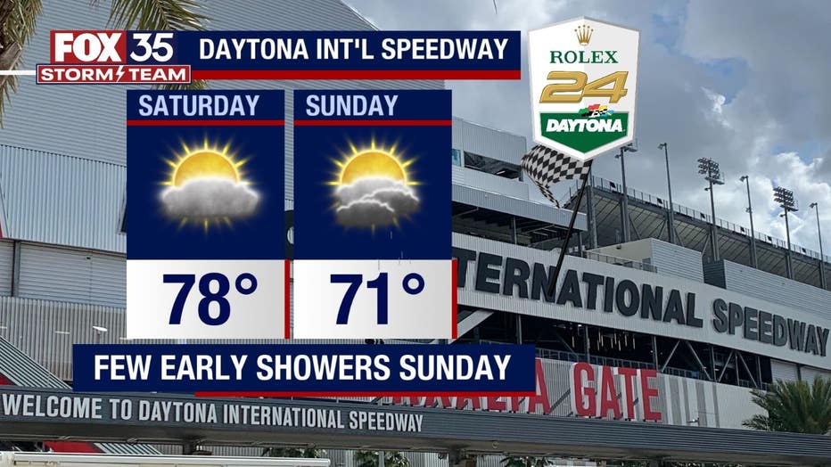 THIS WEEKEND: The weekend will start out like much of the past week with abnormally warm weather. Highs will climb to near-record levels Saturday into the low to mid 80s under partly cloudy skies with a breezy south wind. An isolated sprinkle can't be ruled out this afternoon. We'll stay mild overnight with lows into the 60s ahead of our Sunday cold front. That front will bring a chance of scattered showers and an isolated thunderstorm early in the morning from west to east. Rain chances will lower farther to the east and exit by lunchtime. A brief downpour is possible, but rain totals look modest for Central Florida. Behind the front, we'll see cooler weather Sunday afternoon with highs back in the upper 60s to low 70s and clearing skies into the afternoon. Overall the weather for the Rolex 24 looks good aside from the brief rain chance late in the morning in Daytona.