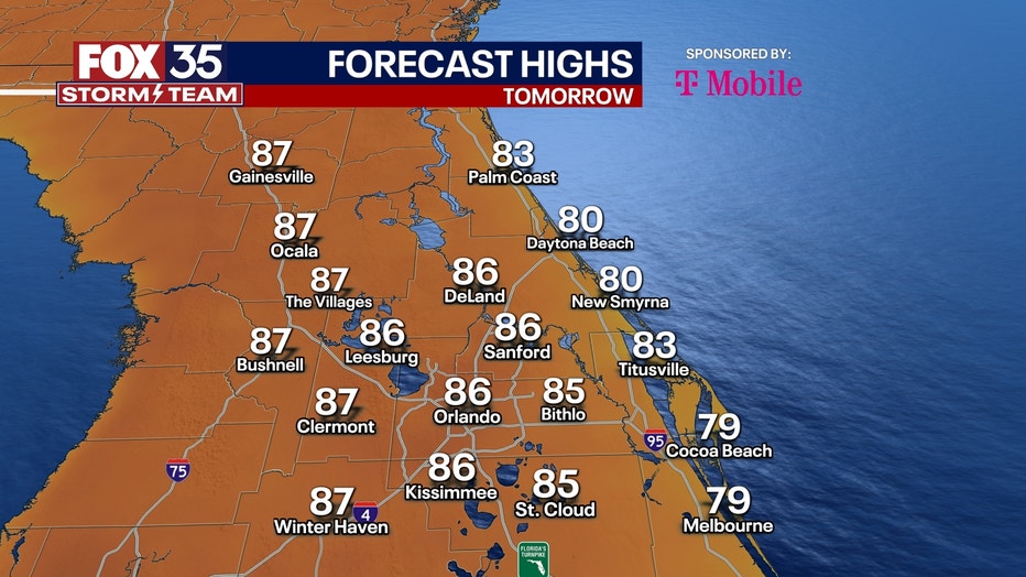 MONDAY: Not as cool to start out the day tomorrow with lows mostly in the upper 50s to low 60s. Sunshine and warming temps continue to begin the week. Highs will warm well into the 80s on Monday under mostly sunny skies.