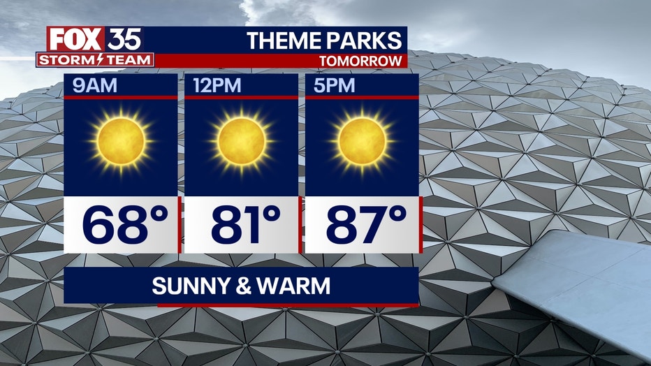 THEME PARK FORECAST: It will be warm at the parks Monday with lots of sunshine so don't forget to stay hydrated! Highs reach near 86 degrees.