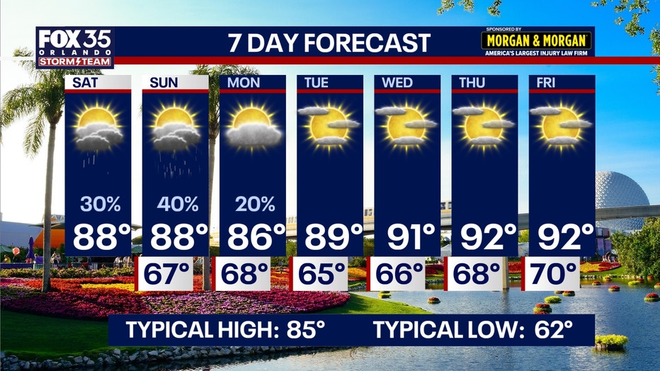 The best bet for these will be across the heart of the FOX 35 Viewing Area. Highs rise above normal today, topping out in the upper 80s.