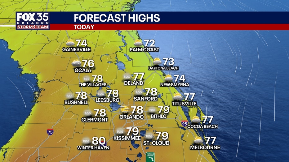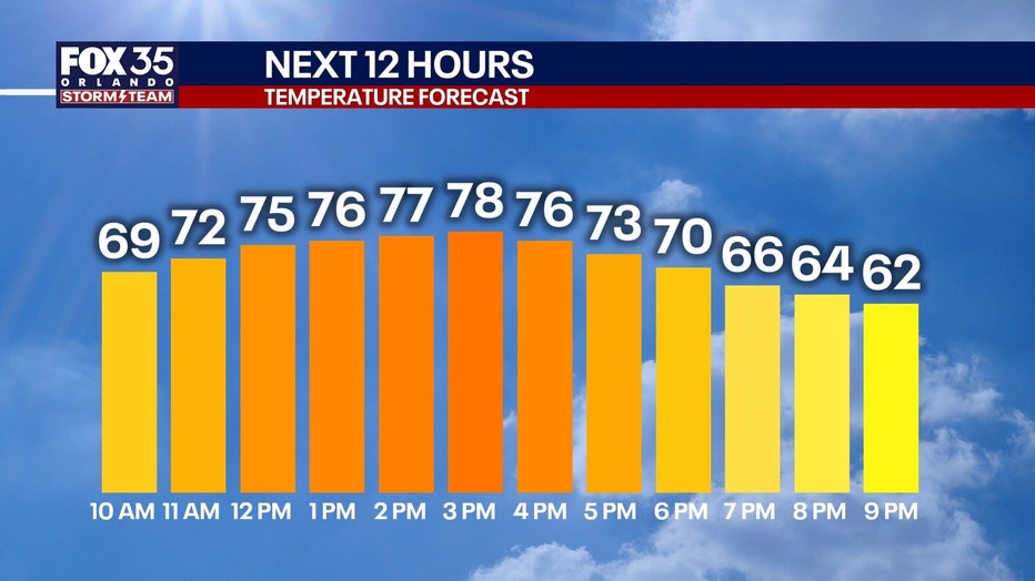 ORLANDO, Fla. - Another warm day is upon us in Central Florida. Temperatures will warm into the mid and upper 70s for highs with a high of 78° in Orlando this afternoon. Even under a partly to mostly clear sky, a good amount of sunshine can be expected.