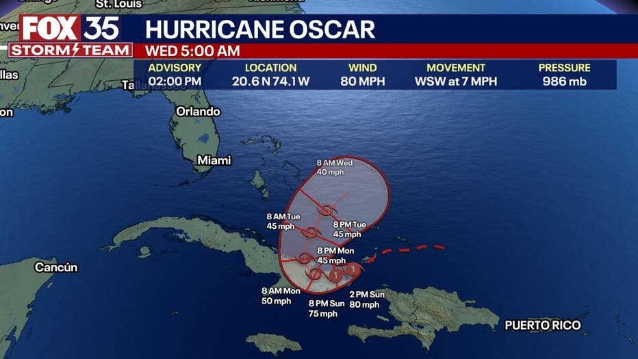 TROPICS: The remnants of Nadine are making their way across Central America and will most likely stop receiving updated later on this evening. Oscar is still a Category One hurricane. It made landfall just before 5 a.m. in Grand Inagua Island and is currently impacting the east coast of Cuba. Oscar will then start to get to make a hard right hook towards the NE and central Atlantic. This is because of the high pressure over our region and a dip in the jet stream steering Oscar away from Florida. Oscar is expected to hold Cat 1 status before fizzling back to a tropical storm. That will help push Oscar out to sea through the first half of the week. Oscar is expected to hold Cat 1 status before fizzling back to a tropical storm.