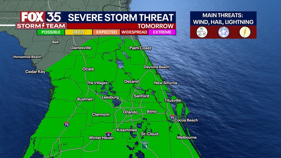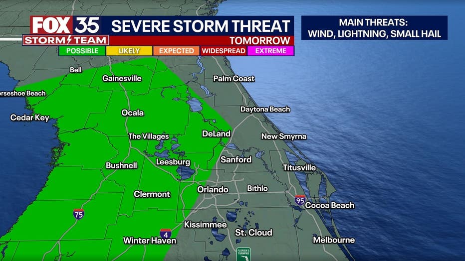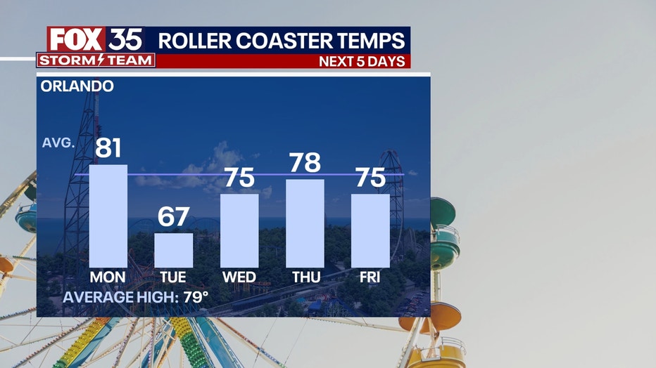 After Monday's front, below average temperatures return to Central Florida. The afternoons will be fair after Tuesday with highs in the mid/upper 70s the rest of the week. In terms of our rain chances, models indicate a Gulf system will head towards Florida Friday and bring a decent chance of rain to end the week. Severe potential appears limited for now, but keep checking back in for more on the forecast.