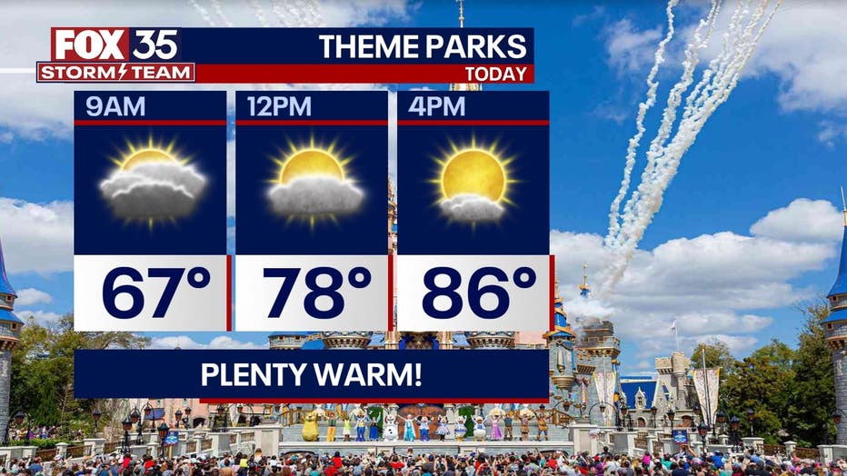 Another warm and humid day at the parks with the high approaching 88 degrees. No rain is expected.