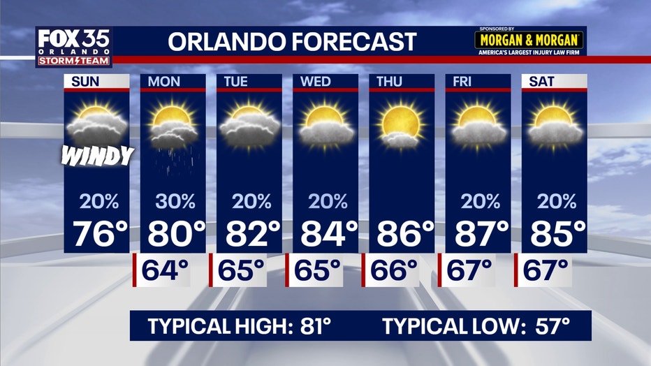 ORLANDO, Fla. - Our Sunday begins on a blustery note across Central Florida with spotty showers in the works. A wind advisory is in effect for coastal Brevard and Volusia County until 4:00 p.m. for wind gusts of 30–35 mph.