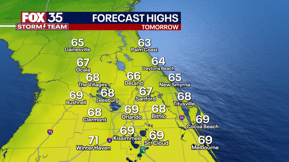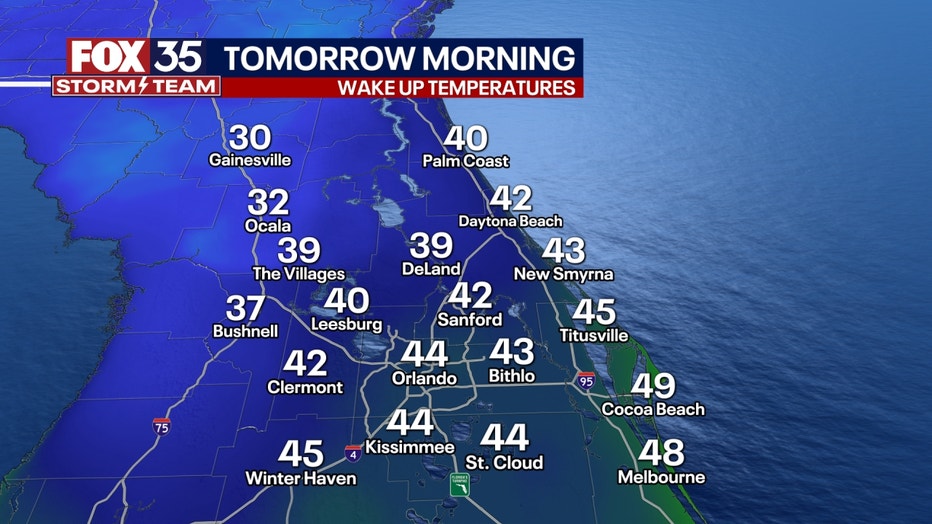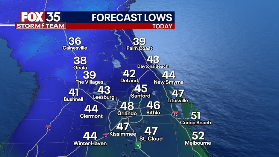 Temperatures in the Orlando metro will stay within the 40s, while parts of The Villages, Ocala, and Gainesville will dip into the high 30s. Cocoa Beach and Melbourne should stay in the upper 40s and 50s.
