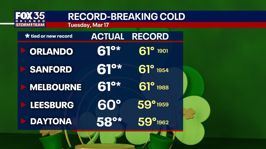 St. Patrick's Day set a new cold record for March, 17. The low was 58 degrees, breaking the previous record of 59 degrees set in 1962.