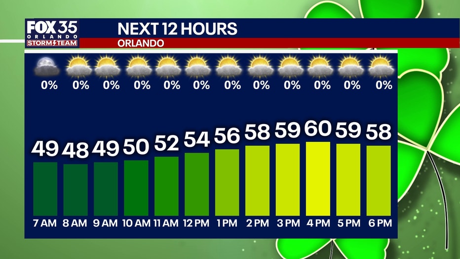 Afternoon temperatures for March 17, St. Patrick's Day, will only reach the upper 50s for highs along the coast in Volusia and Flagler Counties and the low 60s for the rest of Central Florida. For perspective, this is nearly twenty degrees below our average (or typical) highs for today's date. These are usually around the upper 70s, 79° to be exact in Orlando.
