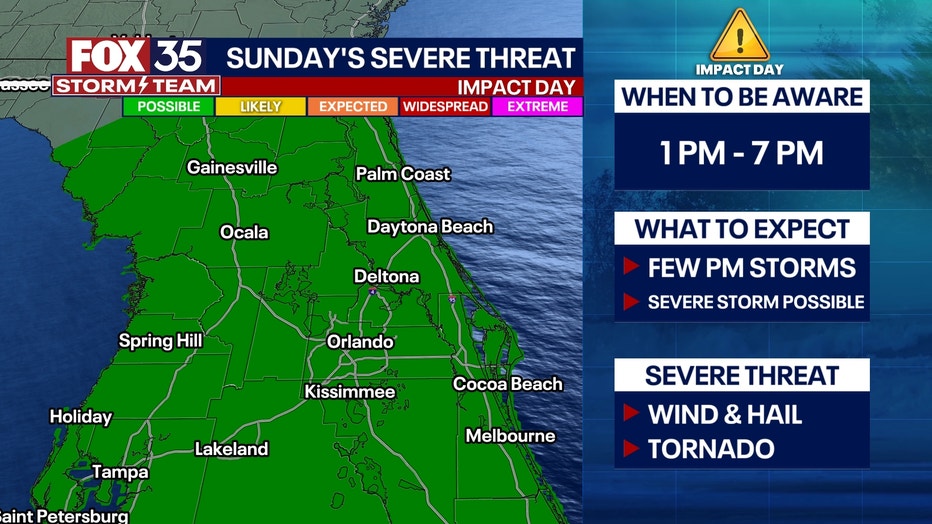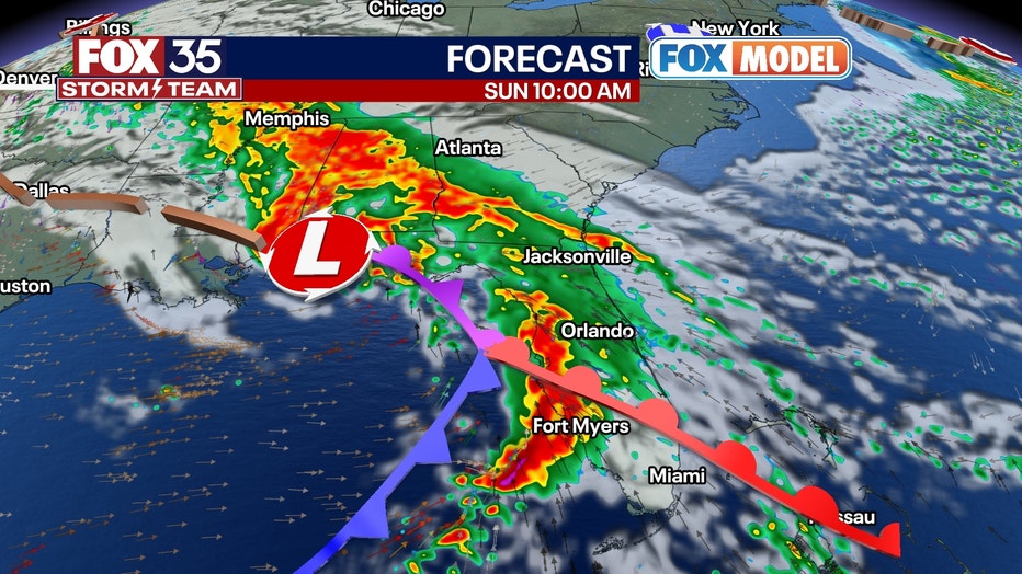 LOOKING AHEAD: Sunday's system will linger off the east coast of Florida and bring more unsettled weather to begin the week. A few showers and storms will be possible on Monday with mostly cloudy skies and cooler highs into the 60s. On Tuesday, rain chances fall off, but a gusty north wind will develop in the system's wake. Gusts up to 30-40 mph will be possible. We will see gradually warming weather through the rest of the week