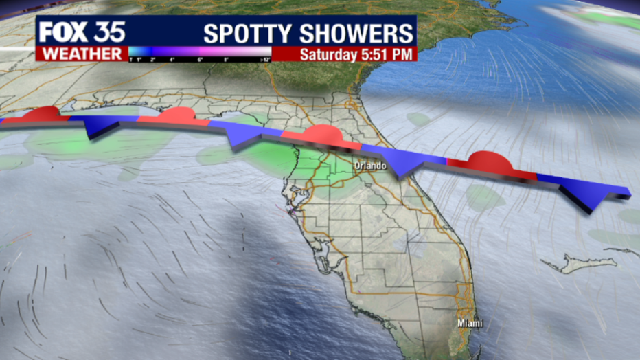 The front will increase the cloud cover and bring a few spotty showers, mainly north of I-4 Friday night.