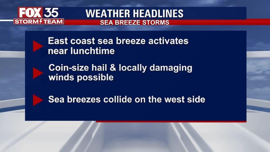 The sea breeze storms will active on Monday. The east coast sea breeze will dominate, causing all of the storms to move west across the Florida peninsula Monday afternoon and early evening.